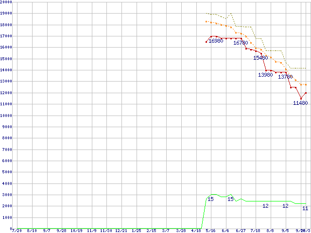 ※このグラフは過去のデータも税率5%相当に調整した税込み相当額のグラフです。 税率変更や、総額表示方式導入(2004年4月)の影響は除いています。 | | | ●凡例 | 最安値 (点線部は販売店未確認 または未調査) | 平均値 | 最高値 | ショップ数 |