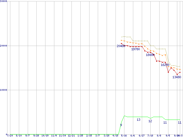 | Phenom X3 8750 (2.4GHz,L2 512KB×3,L3 2MB)の価格推移 | | | (2007年7月20日~2008年10月3日) |