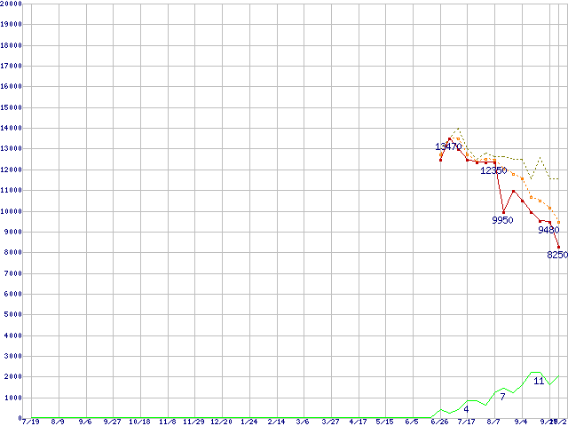※このグラフは過去のデータも税率5%相当に調整した税込み相当額のグラフです。 税率変更や、総額表示方式導入(2004年4月)の影響は除いています。 | | | ●凡例 | 最安値 (点線部は販売店未確認 または未調査) | 平均値 | 最高値 | ショップ数 |