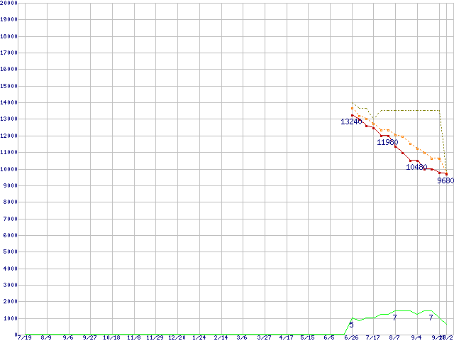 ※このグラフは過去のデータも税率5%相当に調整した税込み相当額のグラフです。 税率変更や、総額表示方式導入(2004年4月)の影響は除いています。 | | | ●凡例 | 最安値 (点線部は販売店未確認 または未調査) | 平均値 | 最高値 | ショップ数 |