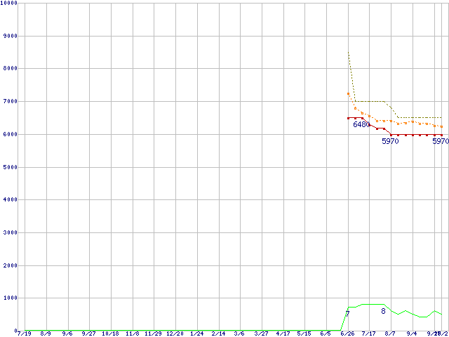 ※このグラフは過去のデータも税率5%相当に調整した税込み相当額のグラフです。 税率変更や、総額表示方式導入(2004年4月)の影響は除いています。 | | | ●凡例 | 最安値 (点線部は販売店未確認 または未調査) | 平均値 | 最高値 | ショップ数 |
