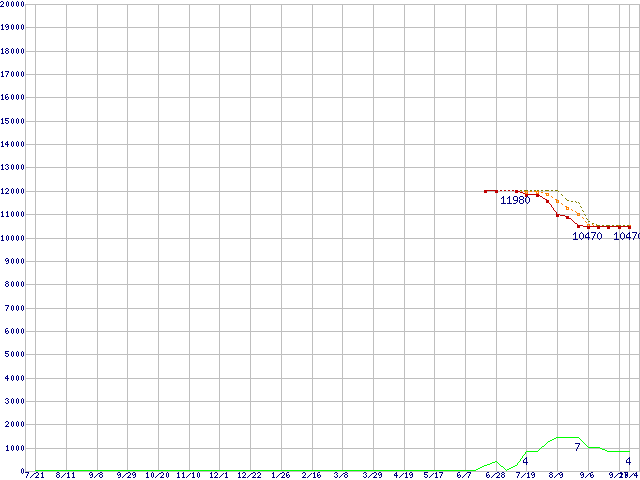 ※このグラフは過去のデータも税率5%相当に調整した税込み相当額のグラフです。 税率変更や、総額表示方式導入(2004年4月)の影響は除いています。 | | | ●凡例 | 最安値 (点線部は販売店未確認 または未調査) | 平均値 | 最高値 | ショップ数 |