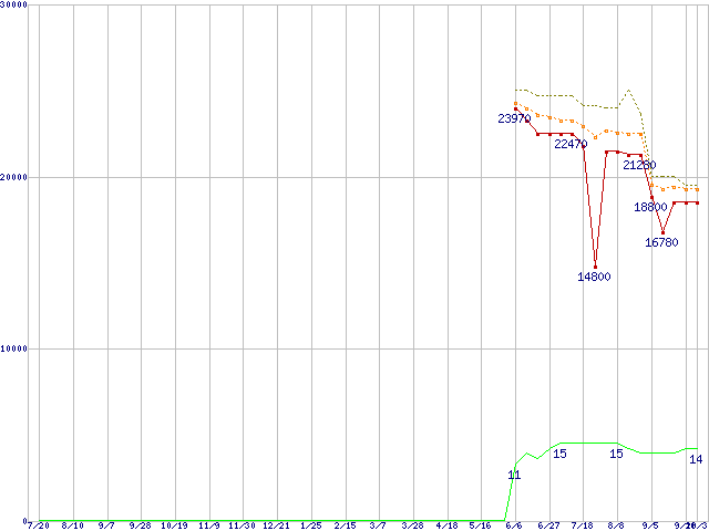 ※このグラフは過去のデータも税率5%相当に調整した税込み相当額のグラフです。 税率変更や、総額表示方式導入(2004年4月)の影響は除いています。 | | | ●凡例 | 最安値 (点線部は販売店未確認 または未調査) | 平均値 | 最高値 | ショップ数 |