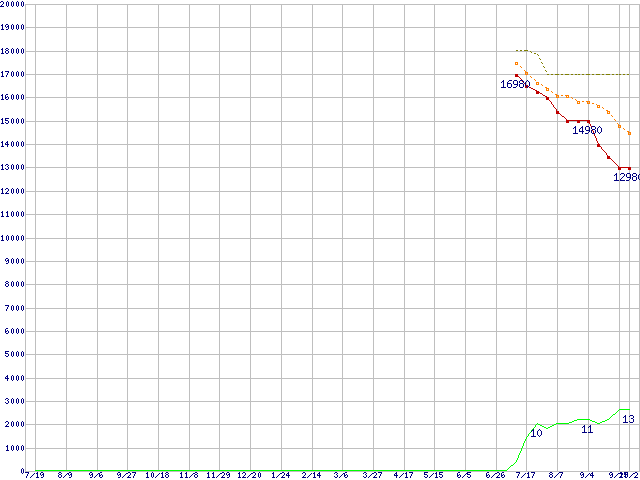 ※このグラフは過去のデータも税率5%相当に調整した税込み相当額のグラフです。 税率変更や、総額表示方式導入(2004年4月)の影響は除いています。 | | | ●凡例 | 最安値 (点線部は販売店未確認 または未調査) | 平均値 | 最高値 | ショップ数 |