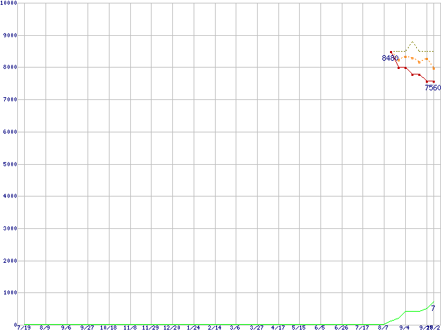 ※このグラフは過去のデータも税率5%相当に調整した税込み相当額のグラフです。 税率変更や、総額表示方式導入(2004年4月)の影響は除いています。 | | | ●凡例 | 最安値 (点線部は販売店未確認 または未調査) | 平均値 | 最高値 | ショップ数 |