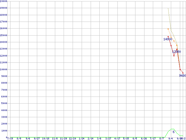 ※このグラフは過去のデータも税率5%相当に調整した税込み相当額のグラフです。 税率変更や、総額表示方式導入(2004年4月)の影響は除いています。 | | | ●凡例 | 最安値 (点線部は販売店未確認 または未調査) | 平均値 | 最高値 | ショップ数 |