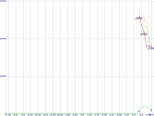 ※このグラフは過去のデータも税率5%相当に調整した税込み相当額のグラフです。 税率変更や、総額表示方式導入(2004年4月)の影響は除いています。 | | | ●凡例 | 最安値 (点線部は販売店未確認 または未調査) | 平均値 | 最高値 | ショップ数 |