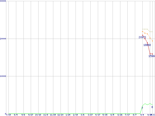 ※このグラフは過去のデータも税率5%相当に調整した税込み相当額のグラフです。 税率変更や、総額表示方式導入(2004年4月)の影響は除いています。 | | | ●凡例 | 最安値 (点線部は販売店未確認 または未調査) | 平均値 | 最高値 | ショップ数 |