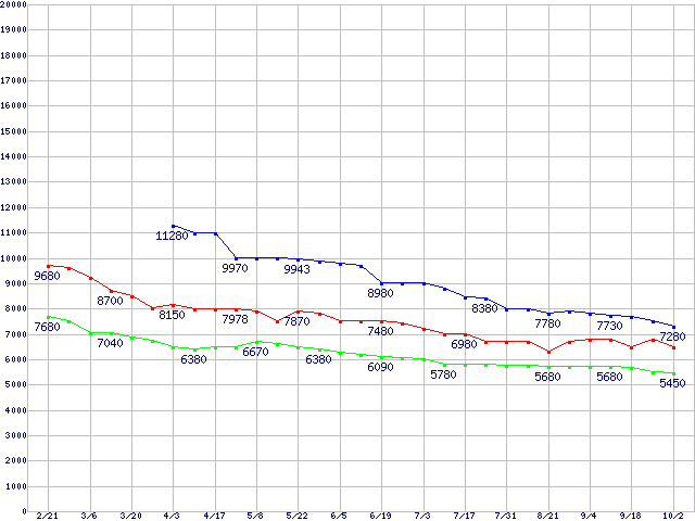WD Caviar Blue (7200rpm,3Gb/s,16MB)の最安値推移