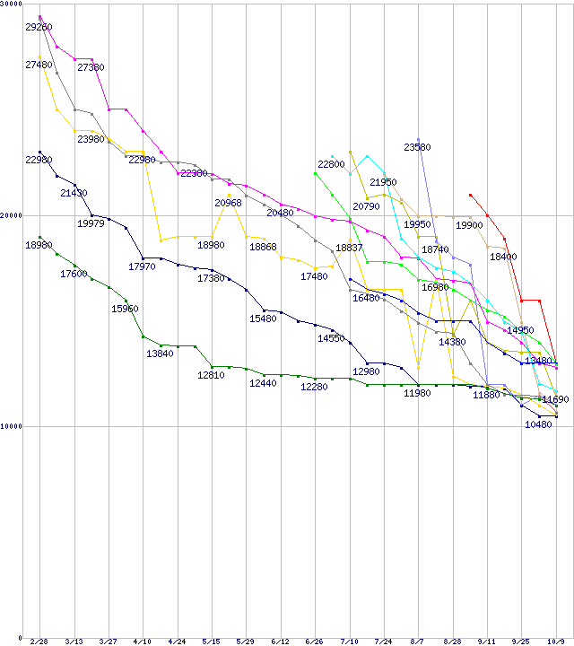 | HDD/SSD主要製品(最安値1万円~1万5千円未満)の最安値推移 | | | (2008年2月28日~2008年10月9日) |