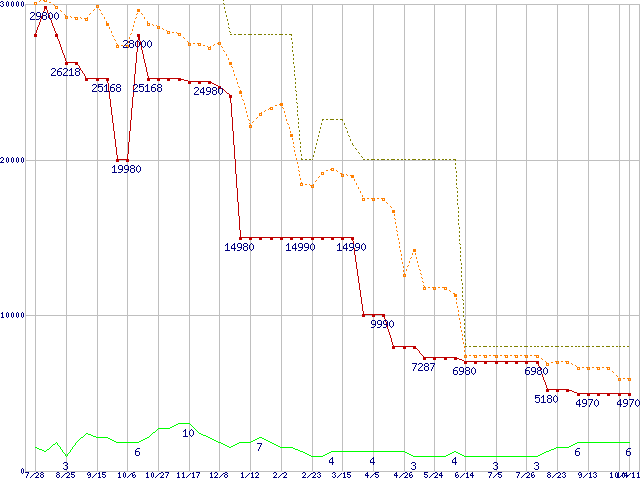 ※このグラフは過去のデータも税率5%相当に調整した税込み相当額のグラフです。 税率変更や、総額表示方式導入(2004年4月)の影響は除いています。 | | | ●凡例 | 最安値 (点線部は販売店未確認 または未調査) | 平均値 | 最高値 | ショップ数 |