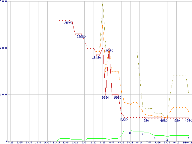 ※このグラフは過去のデータも税率5%相当に調整した税込み相当額のグラフです。 税率変更や、総額表示方式導入(2004年4月)の影響は除いています。 | | | ●凡例 | 最安値 (点線部は販売店未確認 または未調査) | 平均値 | 最高値 | ショップ数 |
