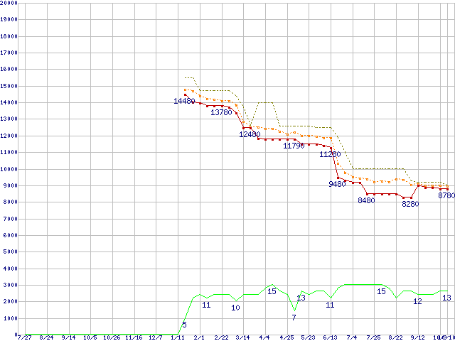 | Athlon X2 5400 (2.8GHz,L2 512KB×2)の価格推移 | | | (2007年7月27日~2008年10月10日) |