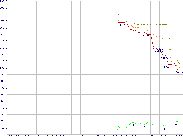 ※このグラフは過去のデータも税率5%相当に調整した税込み相当額のグラフです。 税率変更や、総額表示方式導入(2004年4月)の影響は除いています。 | | | ●凡例 | 最安値 (点線部は販売店未確認 または未調査) | 平均値 | 最高値 | ショップ数 |