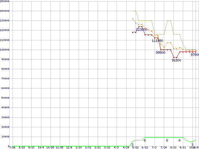 ※このグラフは過去のデータも税率5%相当に調整した税込み相当額のグラフです。 税率変更や、総額表示方式導入(2004年4月)の影響は除いています。 | | | ●凡例 | 最安値 (点線部は販売店未確認 または未調査) | 平均値 | 最高値 | ショップ数 |