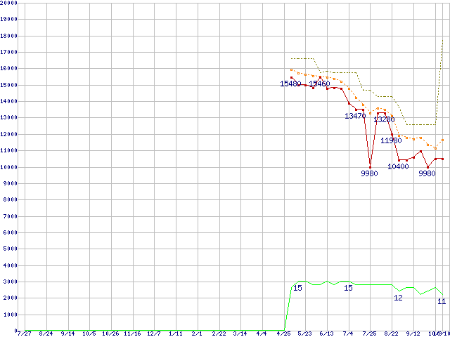 ※このグラフは過去のデータも税率5%相当に調整した税込み相当額のグラフです。 税率変更や、総額表示方式導入(2004年4月)の影響は除いています。 | | | ●凡例 | 最安値 (点線部は販売店未確認 または未調査) | 平均値 | 最高値 | ショップ数 |