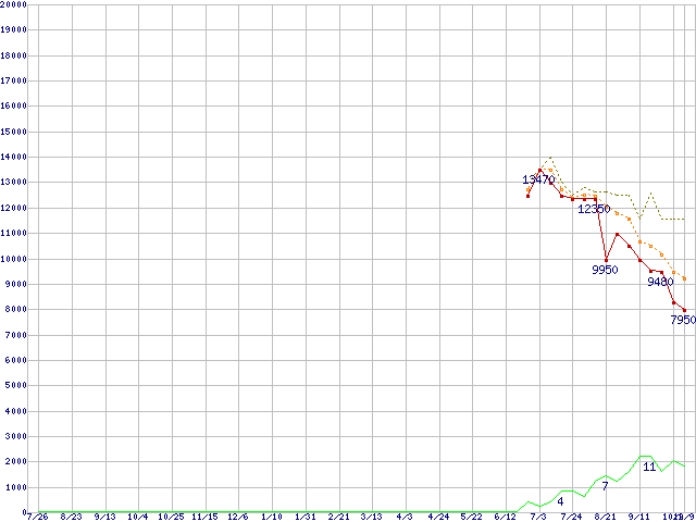 ※このグラフは過去のデータも税率5%相当に調整した税込み相当額のグラフです。 税率変更や、総額表示方式導入(2004年4月)の影響は除いています。 | | | ●凡例 | 最安値 (点線部は販売店未確認 または未調査) | 平均値 | 最高値 | ショップ数 |