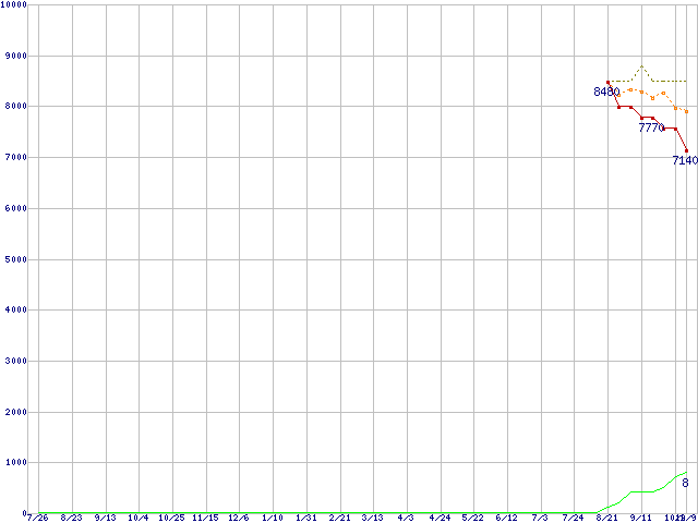 ※このグラフは過去のデータも税率5%相当に調整した税込み相当額のグラフです。 税率変更や、総額表示方式導入(2004年4月)の影響は除いています。 | | | ●凡例 | 最安値 (点線部は販売店未確認 または未調査) | 平均値 | 最高値 | ショップ数 |