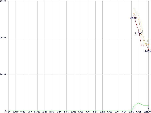 ※このグラフは過去のデータも税率5%相当に調整した税込み相当額のグラフです。 税率変更や、総額表示方式導入(2004年4月)の影響は除いています。 | | | ●凡例 | 最安値 (点線部は販売店未確認 または未調査) | 平均値 | 最高値 | ショップ数 |