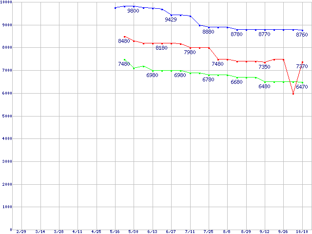 | Socket AM2 (HyperTransport,Dual Core,TDP 45W)の最安値推移 | | | (2008年2月29日~2008年10月10日) |