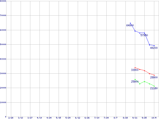 | PATRIOT Extreme Performance Warp Solid State Disk (SSD,3Gb/s,2.5インチ)の最安値推移 | | | (2008年2月28日~2008年10月9日) |