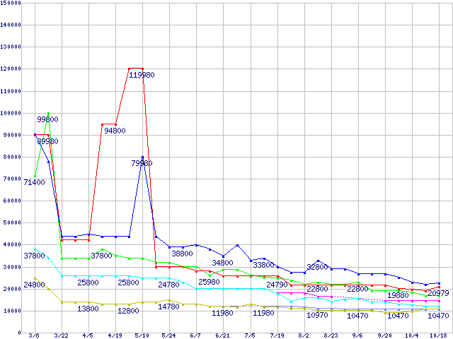 メモリ主要製品(最安値1万円以上)の最安値推移