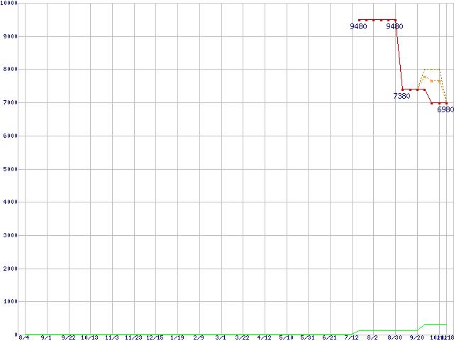 ※このグラフは過去のデータも税率5%相当に調整した税込み相当額のグラフです。 税率変更や、総額表示方式導入(2004年4月)の影響は除いています。 | | | ●凡例 | 最安値 (点線部は販売店未確認 または未調査) | 平均値 | 最高値 | ショップ数 |