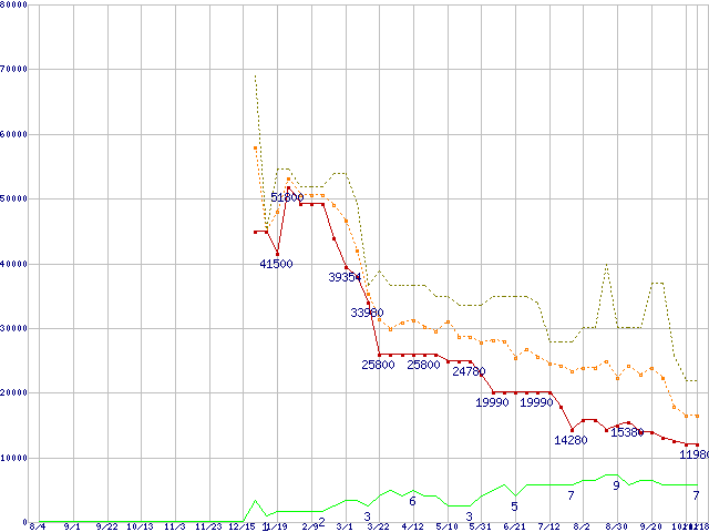 ※このグラフは過去のデータも税率5%相当に調整した税込み相当額のグラフです。 税率変更や、総額表示方式導入(2004年4月)の影響は除いています。 | | | ●凡例 | 最安値 (点線部は販売店未確認 または未調査) | 平均値 | 最高値 | ショップ数 |
