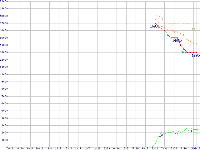 ※このグラフは過去のデータも税率5%相当に調整した税込み相当額のグラフです。 税率変更や、総額表示方式導入(2004年4月)の影響は除いています。 | | | ●凡例 | 最安値 (点線部は販売店未確認 または未調査) | 平均値 | 最高値 | ショップ数 |