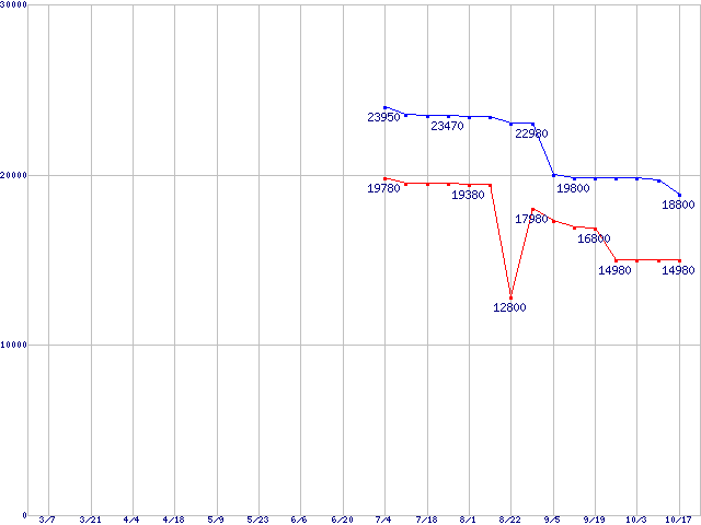 | Socket AM2 (HyperTransport 3.0,Quad Core,TDP 65W)の最安値推移 | | | (2008年3月7日~2008年10月17日) |