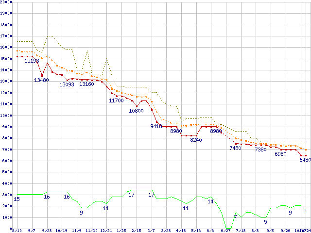 ※このグラフは過去のデータも税率5%相当に調整した税込み相当額のグラフです。 税率変更や、総額表示方式導入(2004年4月)の影響は除いています。 | | | ●凡例 | 最安値 (点線部は販売店未確認 または未調査) | 平均値 | 最高値 | ショップ数 |