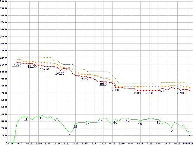 ※このグラフは過去のデータも税率5%相当に調整した税込み相当額のグラフです。 税率変更や、総額表示方式導入(2004年4月)の影響は除いています。 | | | ●凡例 | 最安値 (点線部は販売店未確認 または未調査) | 平均値 | 最高値 | ショップ数 |
