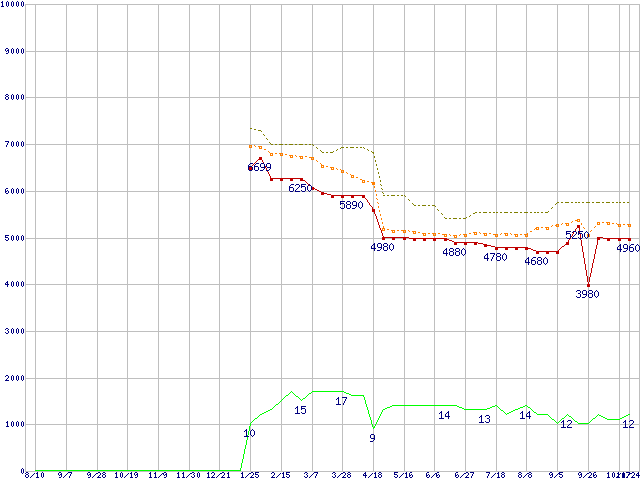 ※このグラフは過去のデータも税率5%相当に調整した税込み相当額のグラフです。 税率変更や、総額表示方式導入(2004年4月)の影響は除いています。 | | | ●凡例 | 最安値 (点線部は販売店未確認 または未調査) | 平均値 | 最高値 | ショップ数 |