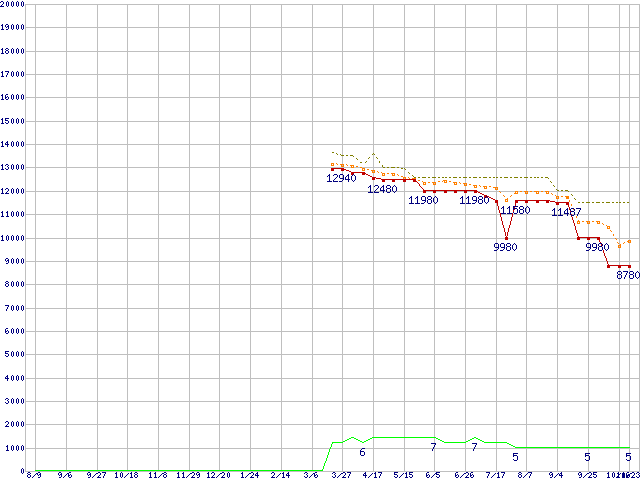※このグラフは過去のデータも税率5%相当に調整した税込み相当額のグラフです。 税率変更や、総額表示方式導入(2004年4月)の影響は除いています。 | | | ●凡例 | 最安値 (点線部は販売店未確認 または未調査) | 平均値 | 最高値 | ショップ数 |