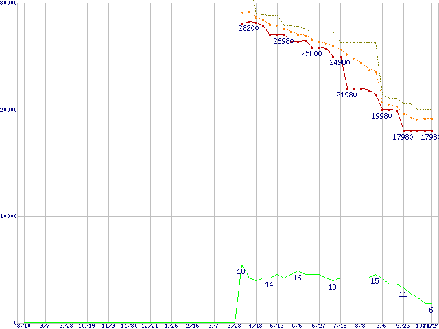 ※このグラフは過去のデータも税率5%相当に調整した税込み相当額のグラフです。 税率変更や、総額表示方式導入(2004年4月)の影響は除いています。 | | | ●凡例 | 最安値 (点線部は販売店未確認 または未調査) | 平均値 | 最高値 | ショップ数 |
