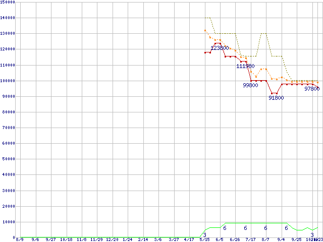 ※このグラフは過去のデータも税率5%相当に調整した税込み相当額のグラフです。 税率変更や、総額表示方式導入(2004年4月)の影響は除いています。 | | | ●凡例 | 最安値 (点線部は販売店未確認 または未調査) | 平均値 | 最高値 | ショップ数 |