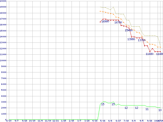 ※このグラフは過去のデータも税率5%相当に調整した税込み相当額のグラフです。 税率変更や、総額表示方式導入(2004年4月)の影響は除いています。 | | | ●凡例 | 最安値 (点線部は販売店未確認 または未調査) | 平均値 | 最高値 | ショップ数 |