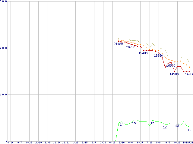 ※このグラフは過去のデータも税率5%相当に調整した税込み相当額のグラフです。 税率変更や、総額表示方式導入(2004年4月)の影響は除いています。 | | | ●凡例 | 最安値 (点線部は販売店未確認 または未調査) | 平均値 | 最高値 | ショップ数 |