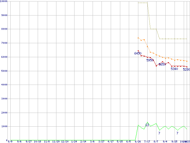 ※このグラフは過去のデータも税率5%相当に調整した税込み相当額のグラフです。 税率変更や、総額表示方式導入(2004年4月)の影響は除いています。 | | | ●凡例 | 最安値 (点線部は販売店未確認 または未調査) | 平均値 | 最高値 | ショップ数 |