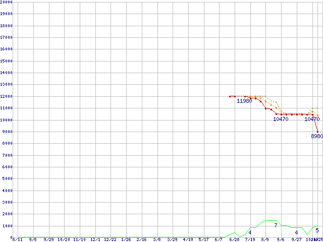 ※このグラフは過去のデータも税率5%相当に調整した税込み相当額のグラフです。 税率変更や、総額表示方式導入(2004年4月)の影響は除いています。 | | | ●凡例 | 最安値 (点線部は販売店未確認 または未調査) | 平均値 | 最高値 | ショップ数 |