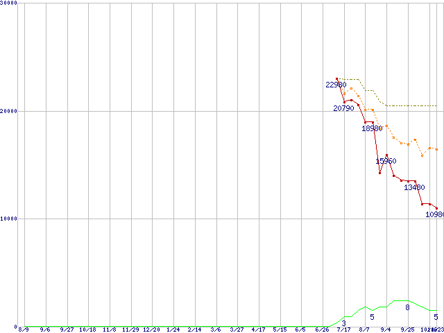 ※このグラフは過去のデータも税率5%相当に調整した税込み相当額のグラフです。 税率変更や、総額表示方式導入(2004年4月)の影響は除いています。 | | | ●凡例 | 最安値 (点線部は販売店未確認 または未調査) | 平均値 | 最高値 | ショップ数 |