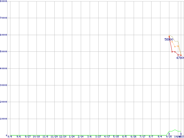 ※このグラフは過去のデータも税率5%相当に調整した税込み相当額のグラフです。 税率変更や、総額表示方式導入(2004年4月)の影響は除いています。 | | | ●凡例 | 最安値 (点線部は販売店未確認 または未調査) | 平均値 | 最高値 | ショップ数 |