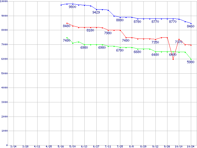 | Socket AM2 (HyperTransport,Dual Core,TDP 45W)の最安値推移 | | | (2008年3月14日~2008年10月24日) |