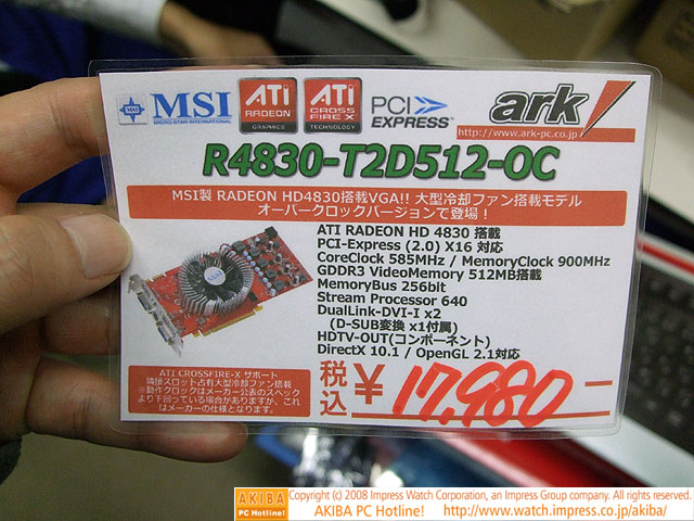 Radeon HD 4800のローエンド「4830」が発売に、1.7万円