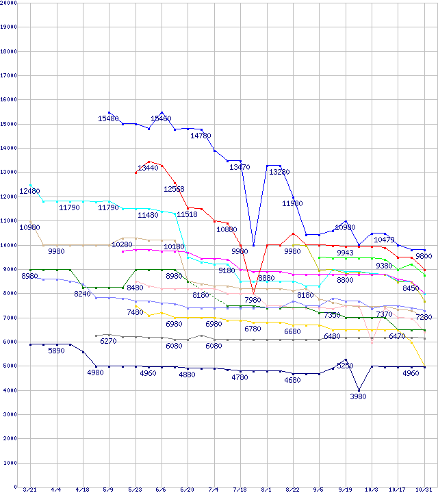 | CPU主要製品(最安値1万円未満)の最安値推移 | | | (2008年3月21日~2008年10月31日) |