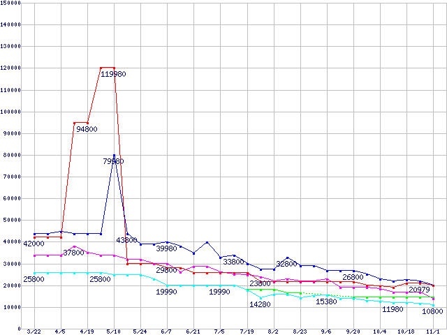 メモリ主要製品(最安値1万円以上)の最安値推移