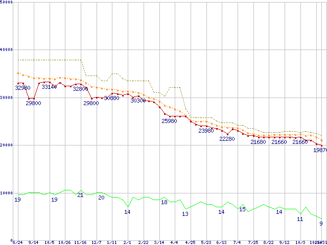 ※このグラフは過去のデータも税率5%相当に調整した税込み相当額のグラフです。 税率変更や、総額表示方式導入(2004年4月)の影響は除いています。 | | | ●凡例 | 最安値 (点線部は販売店未確認 または未調査) | 平均値 | 最高値 | ショップ数 |