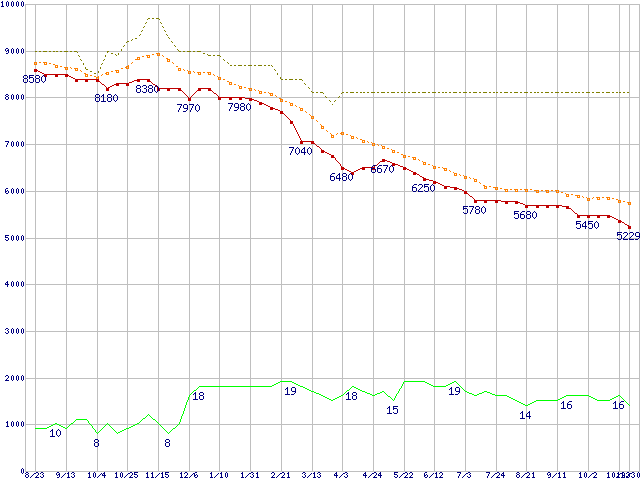 ※このグラフは過去のデータも税率5%相当に調整した税込み相当額のグラフです。 税率変更や、総額表示方式導入(2004年4月)の影響は除いています。 | | | ●凡例 | 最安値 (点線部は販売店未確認 または未調査) | 平均値 | 最高値 | ショップ数 |