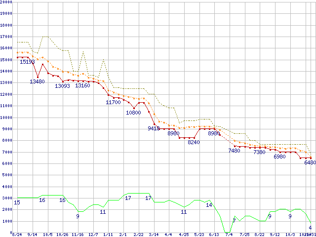 ※このグラフは過去のデータも税率5%相当に調整した税込み相当額のグラフです。 税率変更や、総額表示方式導入(2004年4月)の影響は除いています。 | | | ●凡例 | 最安値 (点線部は販売店未確認 または未調査) | 平均値 | 最高値 | ショップ数 |