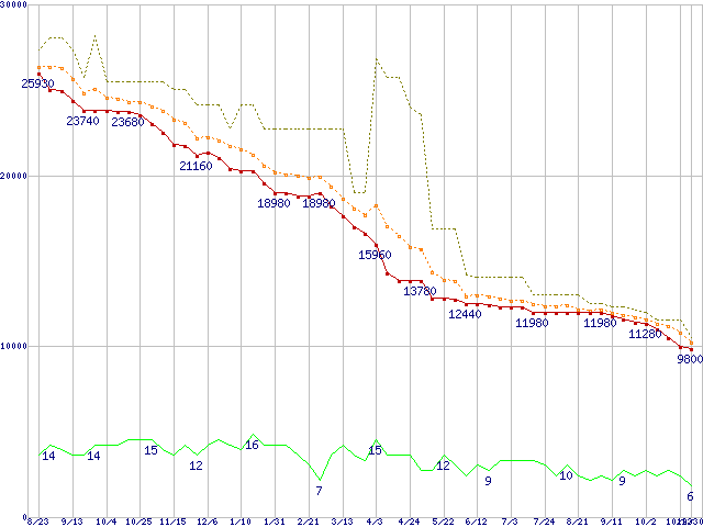 ※このグラフは過去のデータも税率5%相当に調整した税込み相当額のグラフです。 税率変更や、総額表示方式導入(2004年4月)の影響は除いています。 | | | ●凡例 | 最安値 (点線部は販売店未確認 または未調査) | 平均値 | 最高値 | ショップ数 |